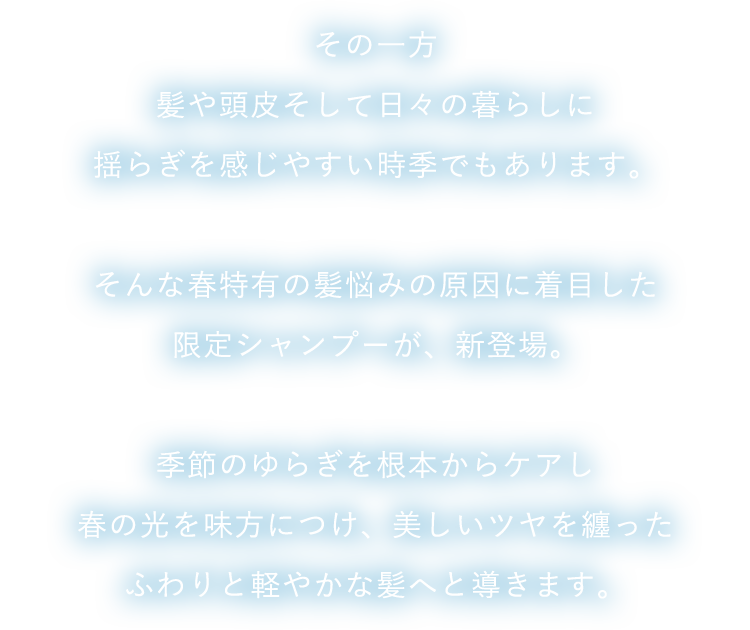 - お湯またはぬるま湯で髪全体を濡らします。髪の長さに合わせて適量を手にとり泡立てて、頭皮に爪を立てないように洗ってください。洗い終えたら、お湯またはぬるま湯で洗い流してください。