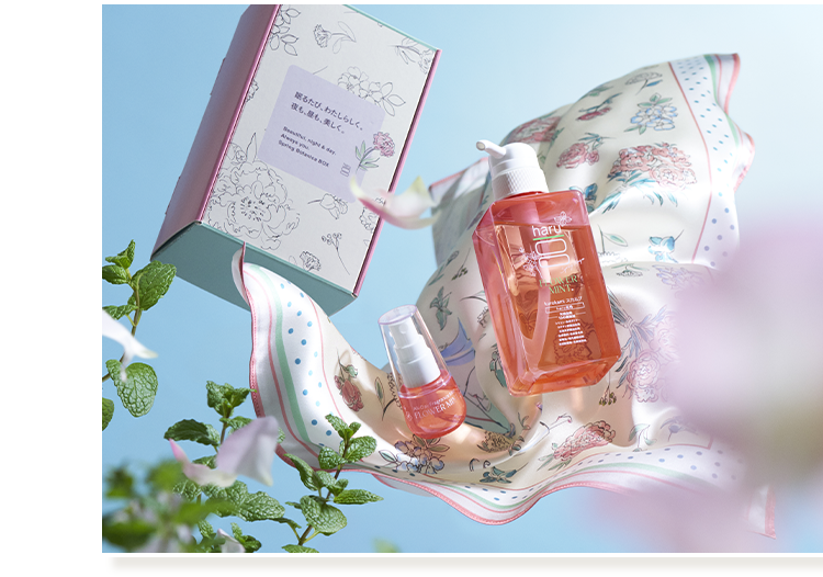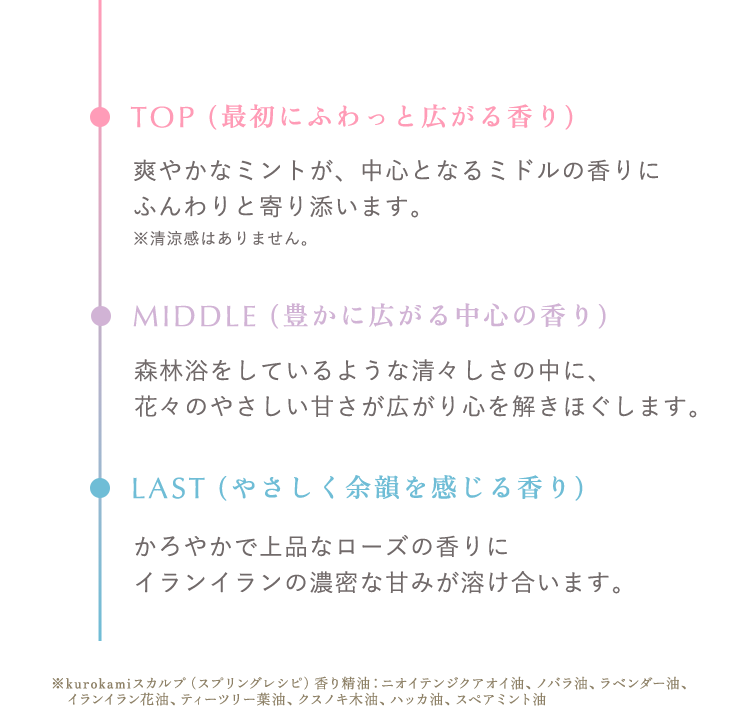 その他の成分/濃グリセリン、グリコシルトレハロース・水添デンプン分解物混合溶液、ジグリセリン、1,2-ペンタンジオール、キサンタンガム、クエン酸ナトリウム、クエン酸、エタノール、モノオレイン酸ポリグリセリル、チンピエキス、ウメ果実エキス、ノリウツギエキス、セイヨウハッカエキス、1,3-ブチレングリコール、異性化糖、メリッサエキス、ユズエキス、オトギリソウエキス、セージエキス、セイヨウノコギリソウエキス、トレハロース、サンザシエキス、無水エタノール、オレンジ油、ラベンダー油、ローズマリー油、ユーカリ油、ローマカミツレ油