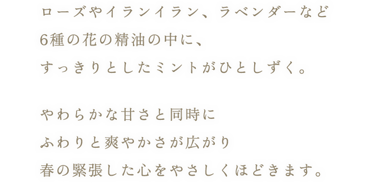 - ミントがすっきりと寄り添う、甘さと深みがある花の香り